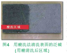 正如前文提到,水泥混凝土產品表面泛堿現象不可能完全避免。根據工程經驗的積累,在正常的氣候環境條件下,混凝土路面磚鋪設使用后,其表面的泛堿現象大約會在兩到三年中自行消失。若出現了用戶不能接受的路面大面積泛堿現象,可以用酸洗法對泛堿區域的路面磚表面進行清洗(圖4)。提醒注意:用酸洗法去除路面磚表面泛堿痕跡的同時,可能會增加形成新的泛堿的風險。酸洗后路面磚表而粗糙度增加,耐清洗能力也會隨之降低。對路面磚表面采用干刷清洗或低壓氣旋吹洗的清理方法,效果更佳,但會增加開支和一些相關的工作量,故實際工程上很少選用。通常只有當酸洗法不能滿足要求時,才會選用。